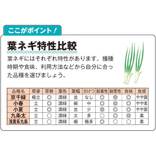 - 耐暑性が強く夏ネギに適しているが、中間・暖地での秋・冬・春出しなど、周年出荷が可能。